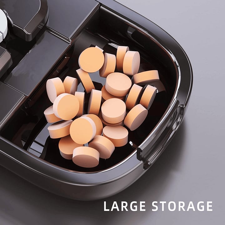 The pill dispenser is equipped with adjustable gears to hold pills securely and achieve clean cuts, allowing for easy cutting into 1/2 or 1/4 pieces.