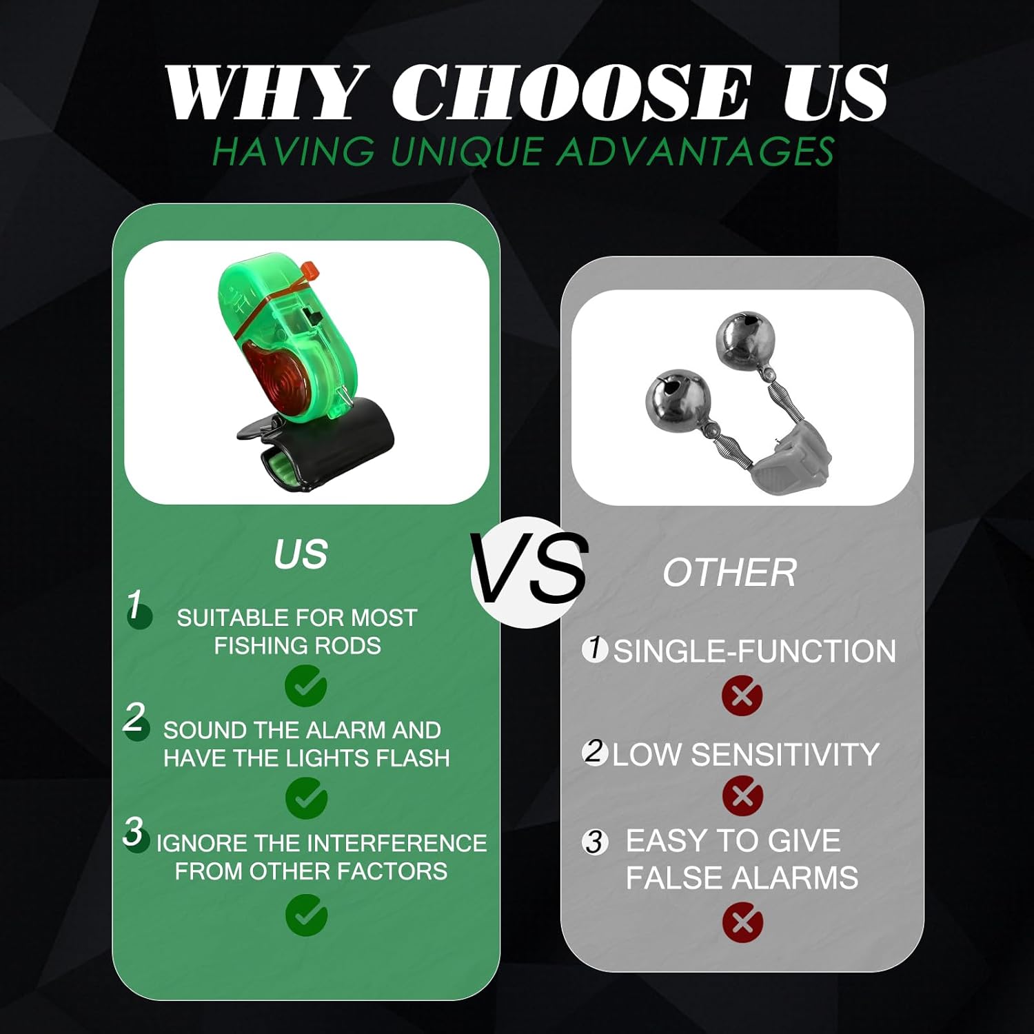 When a fish bites, this device instantly triggers aĀ loud alarm and a high-visibility LED flash. Whether you're chatting with friends or dozing off at night, the audio-visual warning ensures you know exactly when to reel in, even in noisy or dark environments.