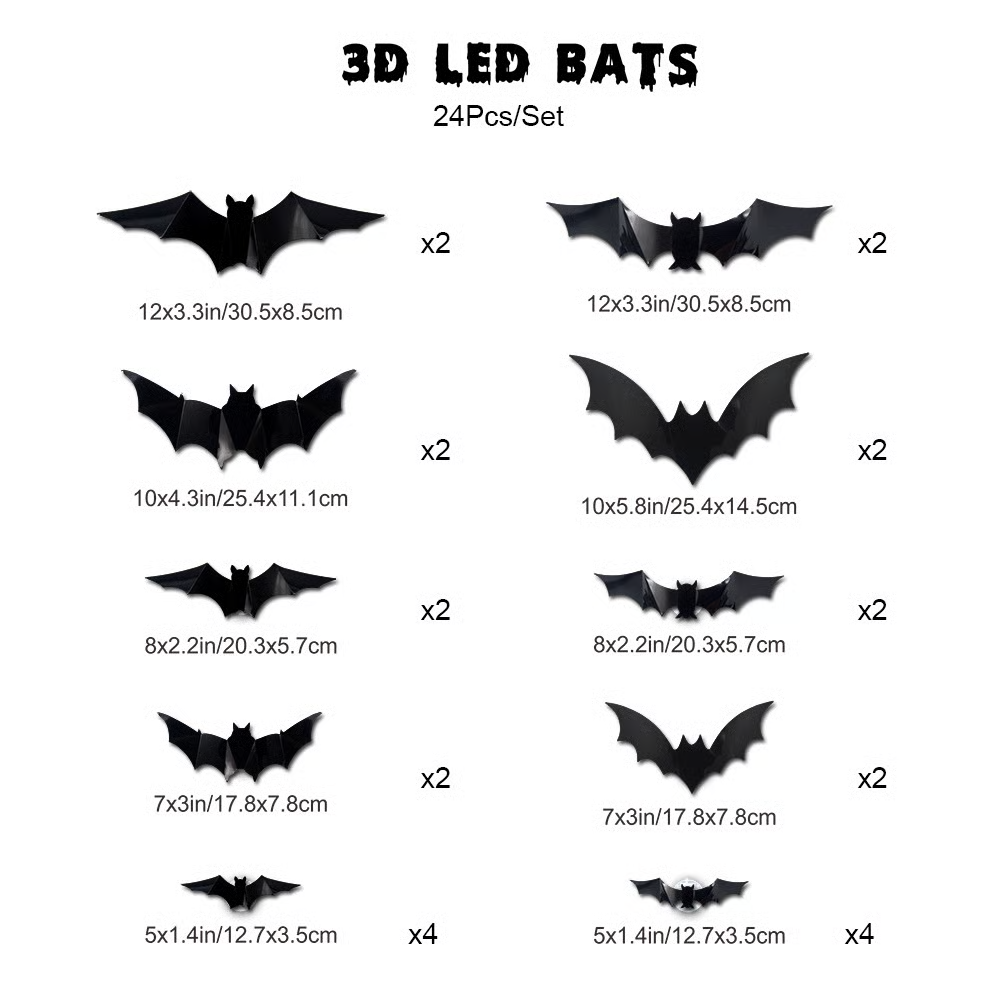 Our Halloween LED bat lights include 10 sizes, different sizes can meet your different decoration needs. The base comes with a small adhesive, suitable for Halloween decoration, meeting your festival use needs.