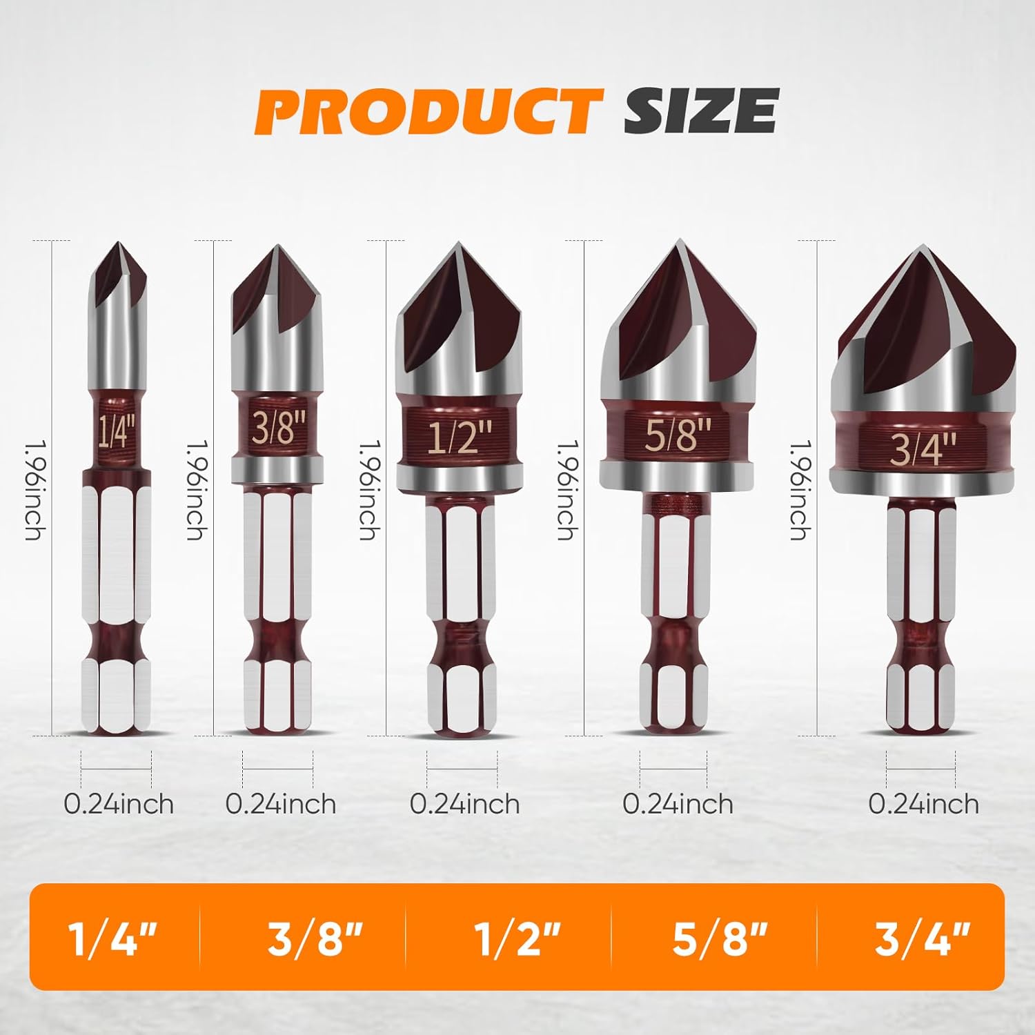 - 5 x Countersink Drill Bits (1/4", 3/8", 1/2", 5/8", 3/4")
