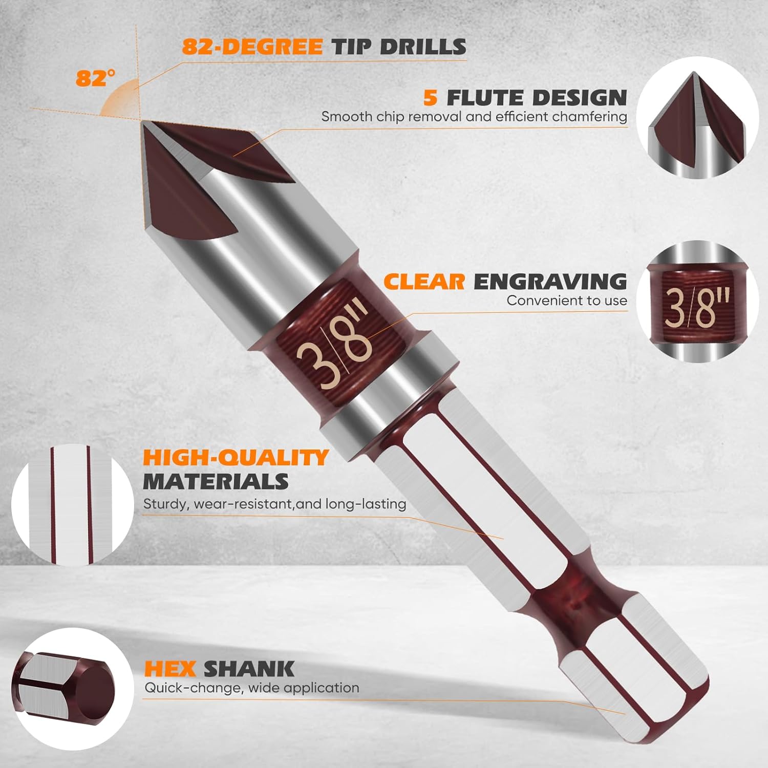 Built for precision and speed. The 82-degree tip ensures perfectly countersunk holes, while the advanced 5-flute design reduces vibration and removes chips smoothly. Combined with clear size engraving and high-quality durable HSS materials, these bits deliver efficient, chatter-free drilling every time.