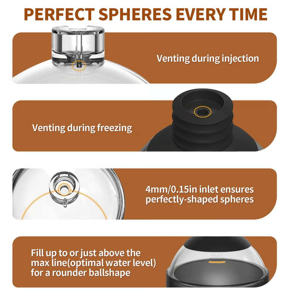 Specialized small water inlet design ensures perfectly round, crystal-clear 2.4-inch ice balls with minimal surface imperfections, keeping whiskey, bourbon, and cocktails colder for longer without diluting the flavor.