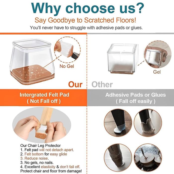 🛒 Perfect for square legs, they fit securely on wood, tile, or parquet to stop scratches. The built-in felt pad prevents slipping and noise, making chairs glide smoothly and quietly.