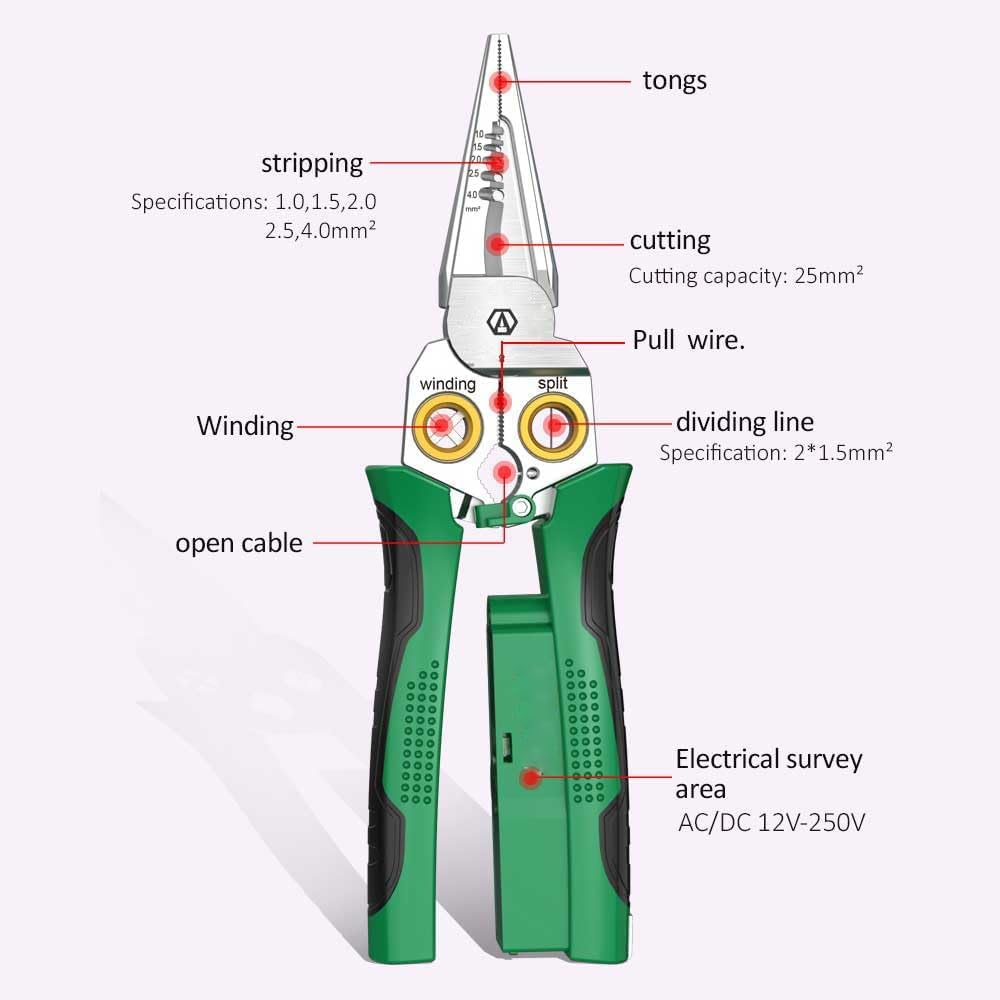 Multi-Functional 8-in-1 Design: This 8-in-1 cable cutter and stripper integrates multiple tools, making it a versatile solution for various electrical operations.